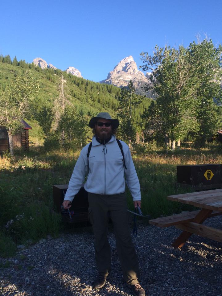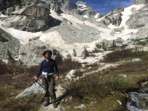 A climber? After a rest day at the brewery in Jackson, WY, a wet night squatting off Cache Creek Rd. A lift out of town the next morning only gets me to Moose, 20 miles short of regaining the Divide Route, but pedaling distance to the Climbers’ Ranch. In good company, hire an ice axe to climb South Teton, crossing paths with another gentleman along the ridge and together, route find to the summit! An ascent up Buck Mt. 2 days later gives me perspective; exposed and technical, I watch a great solo climber summit, from 1,000 below, safely wearing my borrowed bicycle helmet