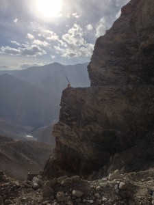 Inside the Inner-Line, a few km south of passing through a checkpoint and climbing high into the Himalayas.Difficult to image but local buses traverse these roads. Here I am looking back at a gut wrenching outside corner i’d just cautiously navigated; the flag pole warner of an infinite drop. Workers were also busy on the inside corner to photographer’s right. It is past noon, so we are looking west.