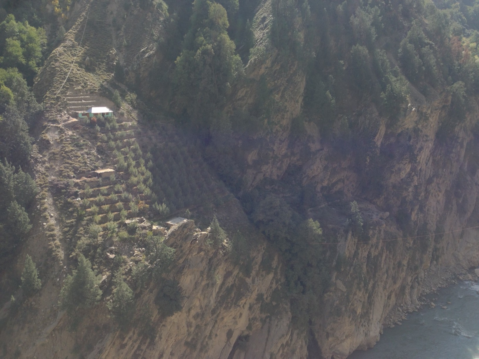 Arriving to Nako from Tabo, the riding was enjoyable and amazing. There were a few snacks available at the second guesthouse I looked at after tromping about the town through low dark quarters with narrow passages and animals; I almost felt like I was intruding though the people where friendly enough. Power did not come on the length of my visit, the entry level kitchen thick with kerosene cooking and I joined in the kitchen to help prepare eggs.Terraced fields outside of my room in the sharp crisp of morning after a very cold night in Nako.A bridge that brings me back over the Spiti, or what is now the Sutlej River. The confluence occurs about Khab, 6 km further upstream (north). Google maps shows a town of Dubling even higher up to the south of this bend in the road, which would be the lefthand side of the river immediate. It is about here that the originally designed Hindustan Tibet Highway would have reached its terminus, having began a rough-for-1860 x kms back in Shimla.Following the Sutlej River on the north side after crossing 6 km south of Khab, I am now running west southwest towards Shimla. The country is very different from Spiti; very wide and green allow the road to stay alongside the river though at times it overruns and takes out section of road according to LP.