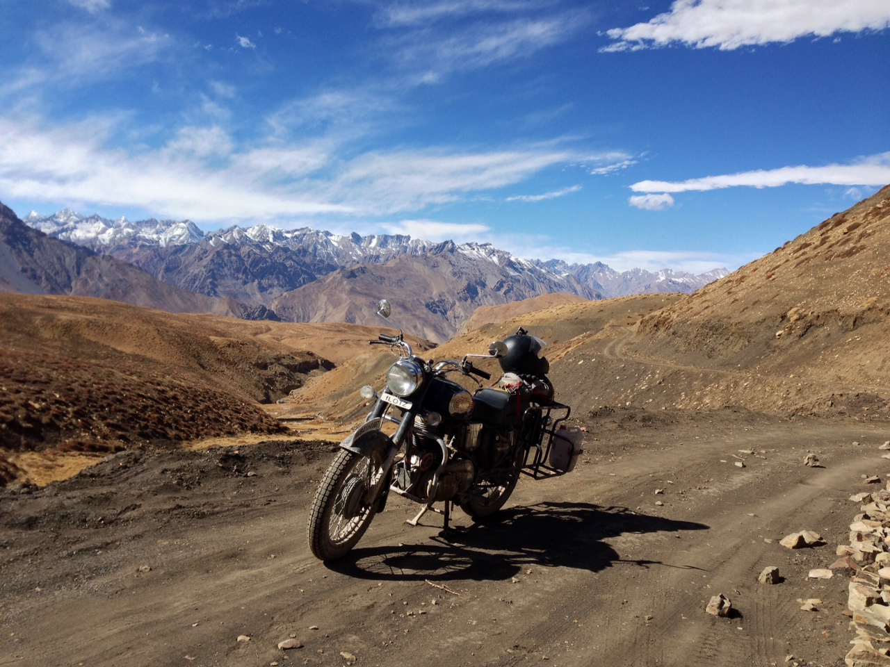 Cresting the Kunzum La (4551 m) then joyfully motoring around a stupa for good luck, I pick up the Spiti river, and a rear puncture flat while riding off the rugged road for a better view of the river. An overhanging sign announced that I’d reached Spiti, a valley following its river namesake. Without a capable lever to pry the cold rubber from the spoked rim and growing dark, I’ll give up with bloody knuckles, stash my heavy tools bag behind a stone wall and done my backpack and start walking for Losar, a godsend that its only 6 km ahead.
