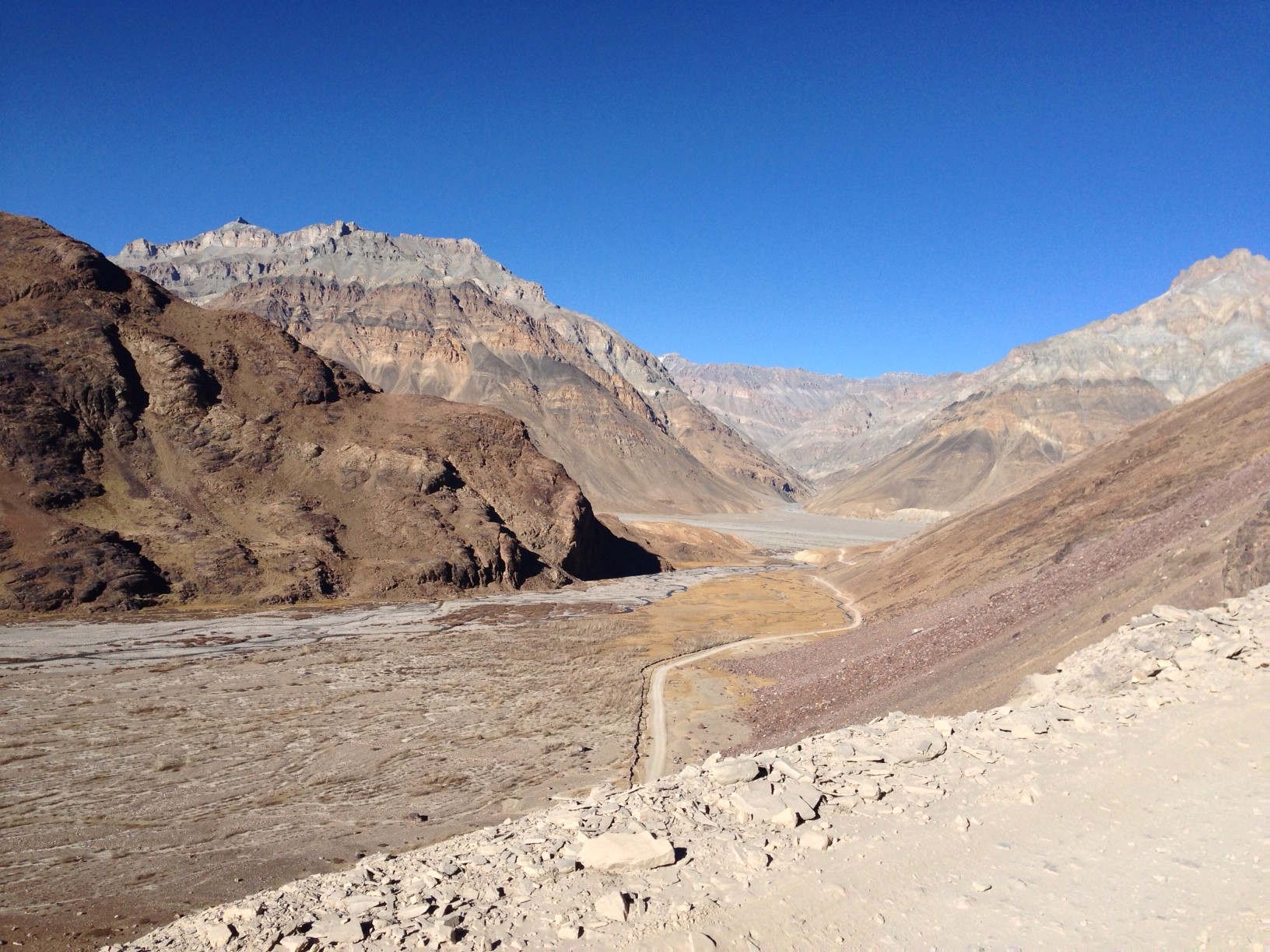 The village of Komic, to the right, and Hikkim to the left. Further left, a gorge that takes the breath away begins to open up to the Spiti and Kaza nearly directly below; the road continues along the high sides with the occasional turret of mountain mixed in with the occasional absence (and thus stacked stones) of mountain.An “enhanced” image of Hikkim and Komic and the small terraced fields that the families work, similar to those at Nako, another small village a few hundred km south of here.Hikkim, above Kaza with the gorge in the background. Its likely that this is where I pulled down on my motorbike to almost become stuck.The gorge at Hikkim, the Spiti in the background, the road following it around on the right. Some sections of the road up here within a half km of town were poured with concrete so you could have roller skated on it, though Im not even sure this is the primary means of ingress and egress; I came in the back way.Passing Hikkim and Komic so high above the town of Kaza and then following a gorge brings me to this edge, where once again I can see Kaza and its handful of small bridges below.